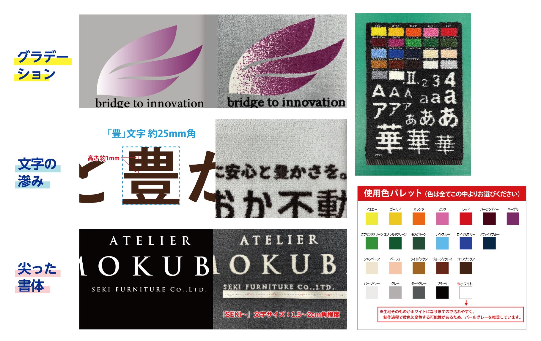 ※オーダーサイズ・大量発注の方はこちらからご相談ください。 ※縦横どちらかが、1800×20000㎜(20M)までは1枚物で製作可能。 ※色は全て既存色(23色の糸色)から。色指定不可。 ※縁ゴムありorなし、同一料金。 ※高温多湿の場所を避け、直射日光の当たらない場所で平に広げて保管して下さい。長時間折りたたんで保管されますと、裏面のゴムがひび割れたり、折り目が付いたりしてしまう事がございます。湿気により接着部分が変色したり・カビたりする恐れがありますのでご注意ください。 |